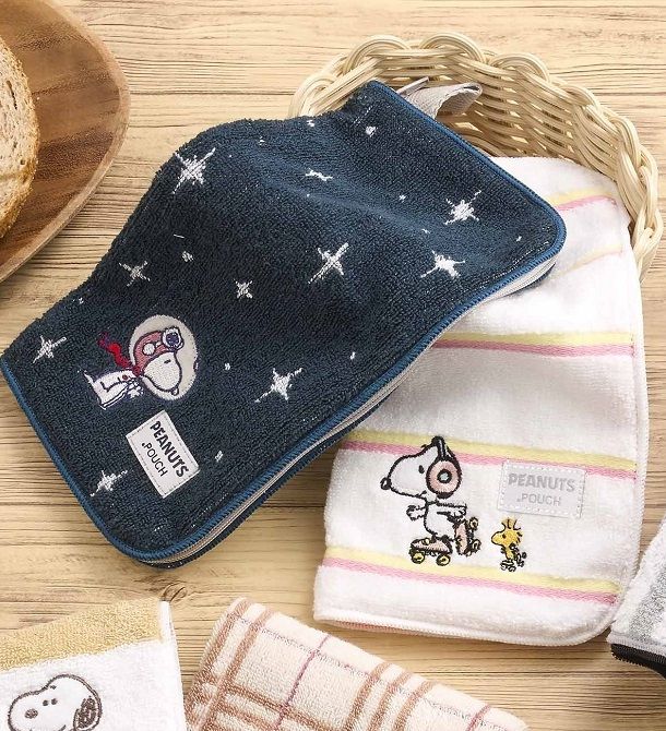 タオルハンカチと見せかけて実はポーチ!小物入れとしてはもちろん、冷たいペットボトルを入れても保冷剤を入れてアイピローにしても便利なポーチです。折り畳み傘を入れて折り畳み傘ケースとしてもご使用いただけます。アストロノーツスヌーピーの刺繍がワンポイントでさりげない可愛さになっています。シンプルなデザインのため、世代・シチュエーション問わず普段使いしやすく、ちょっとしたギフトにもピッタリなアイテムです。