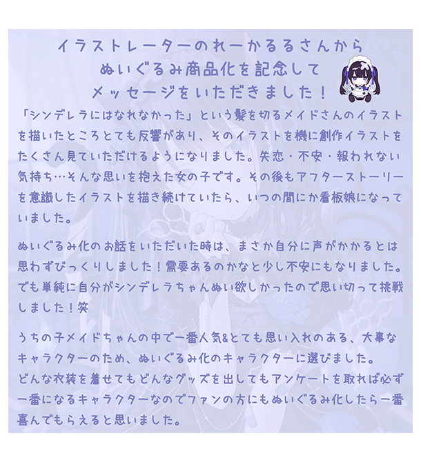 「シンデレラにはなれなかった」という髪を切るメイドさんのイラストから誕生したキャラクターで、失恋・不安・報われない気持ち…そんな思いを抱えた女の子だそうです…!