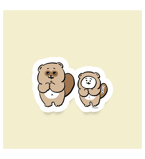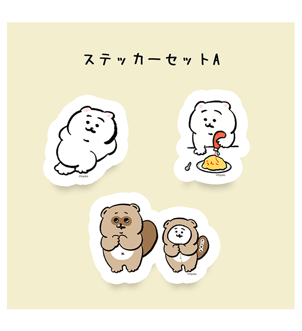 たぬきとたぬきの着ぐるみ姿のねこがとっても可愛いステッカーやオムライスにケチャップで文字を書く姿がチャーミングなステッカーなど、人気のステッカーが3枚入ったセットになっています♪