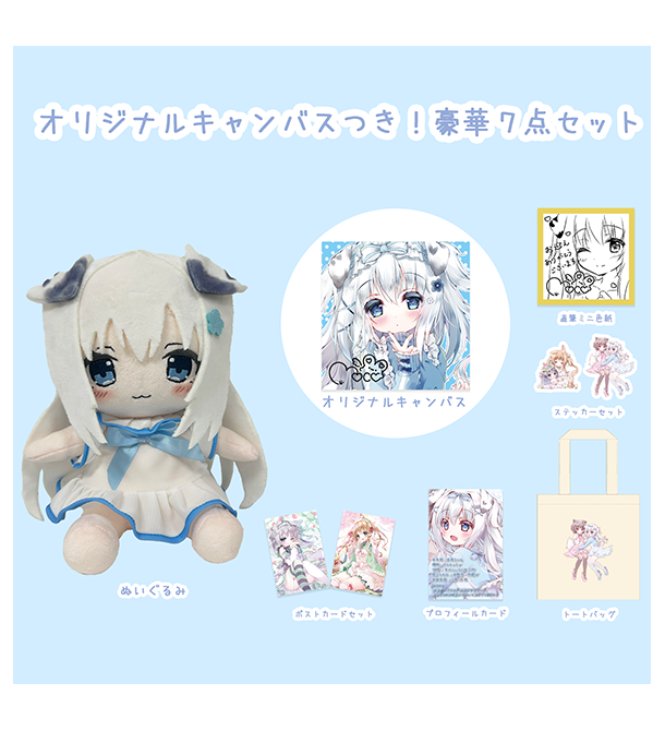 ぬいぐるみに、なんと!mocoさんの直筆サイン入りオリジナルキャンバスと直筆ミニ色紙が入った豪華7点セットです!