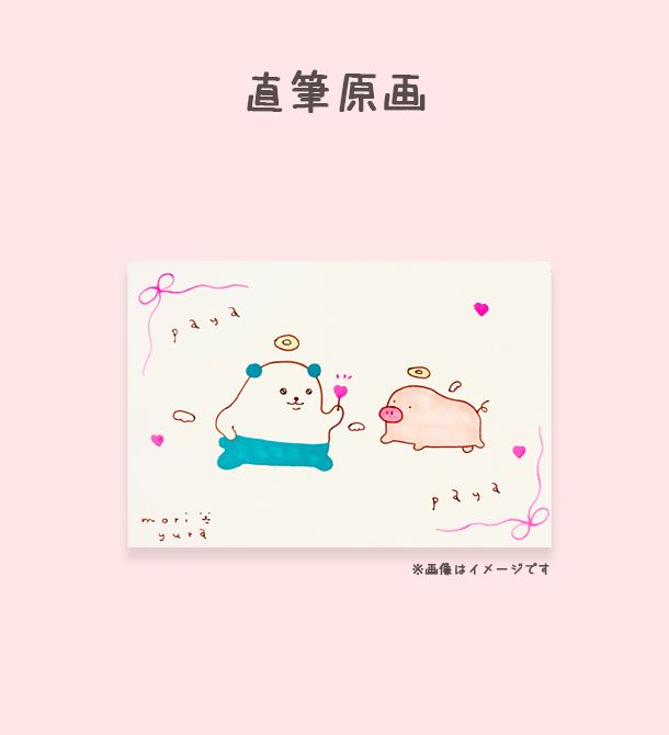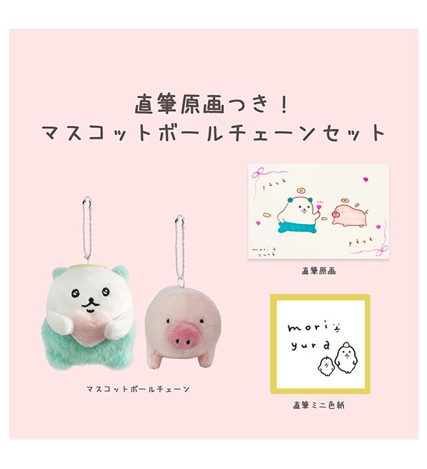 マスコットボールチェーン2体に、なんと!MORI yuraさんの直筆原画と直筆ミニ色紙が入った豪華3点セットです。
