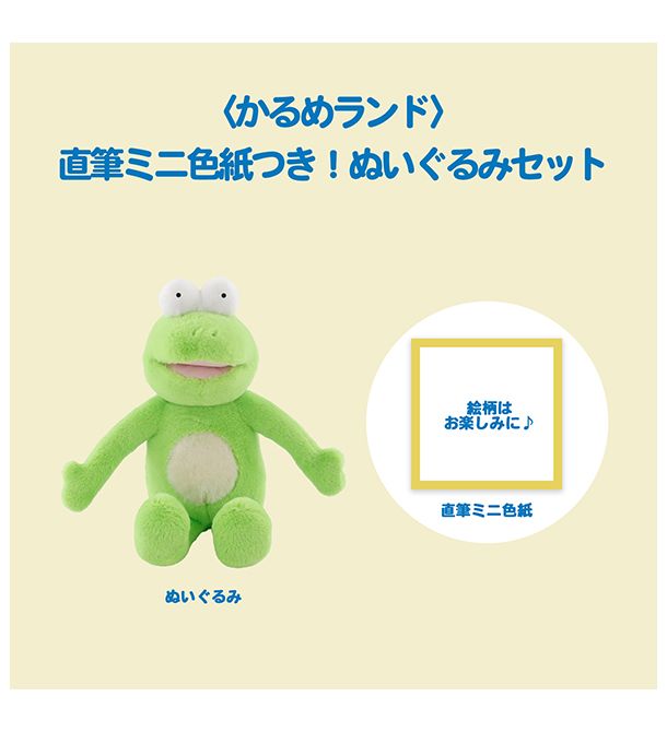 漫画家・イラストレーターのかるめさんが手掛ける「かるめランド」の「かえるのカルパス」のぬいぐるみに、かるめさんの直筆ミニ色紙がついたスペシャルなセットです。